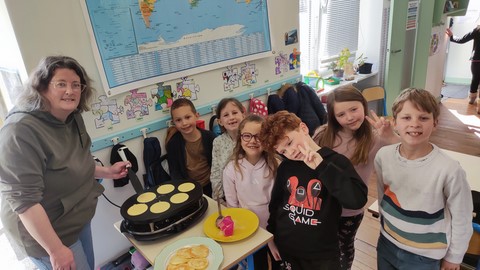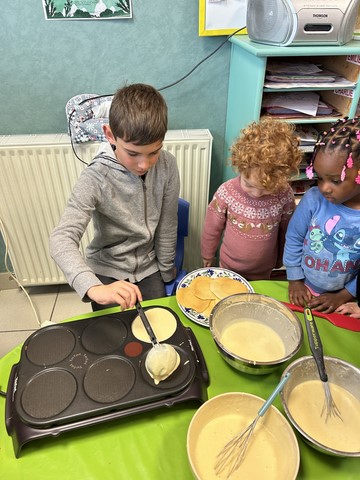 Ce jeudi 26 mars, tous les enfants de l'école ont préparé des pancakes après avoir étudié la recette en anglais.Les plus grands ont aidé les plus petits. Ces pancakes ont été dégustés, accompagnés de sirop d'érable, l'après-midi, à l'occasion du carnaval.